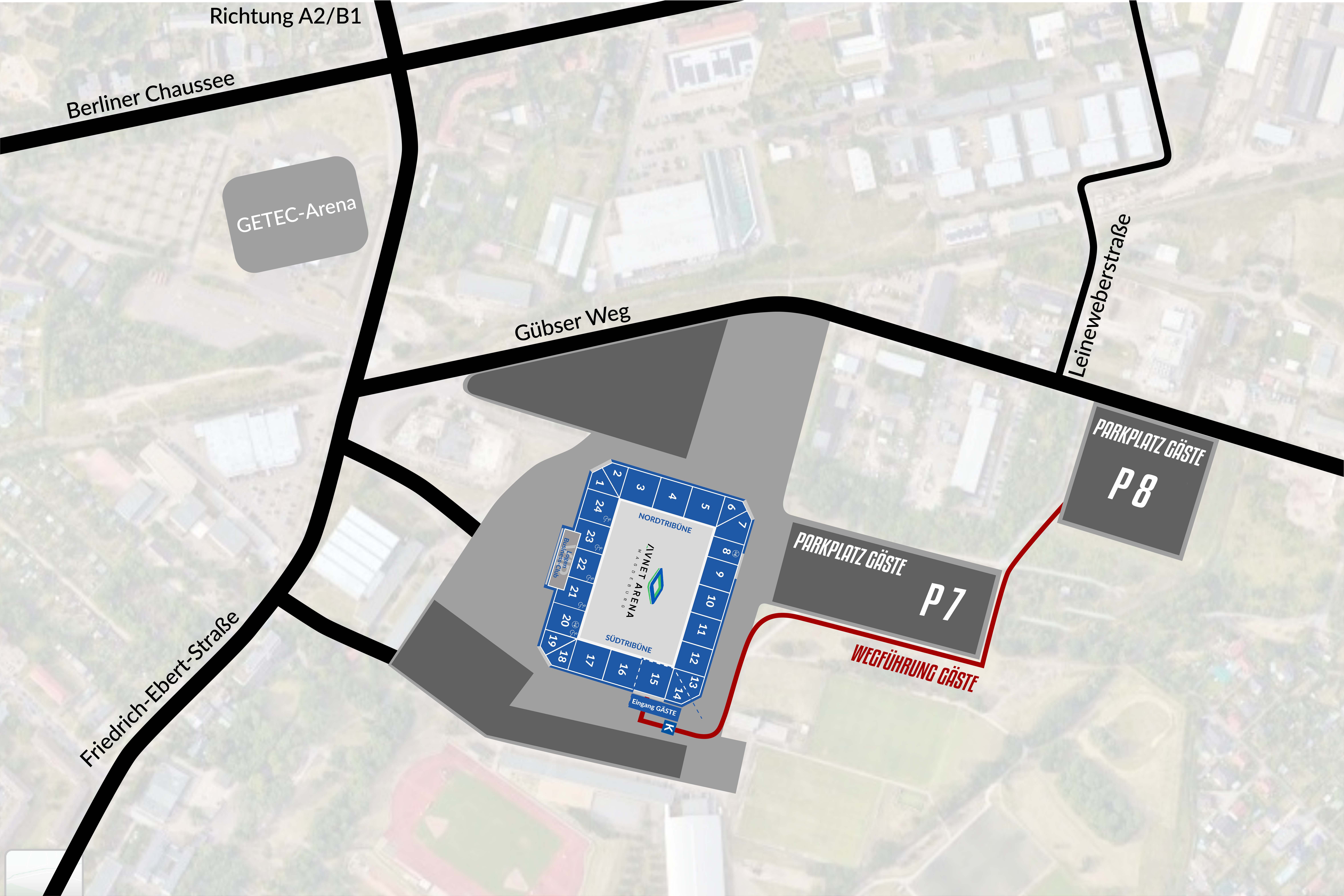 - Gäste-Fan-Busse parken auf dem Gästeparkplatz P8.