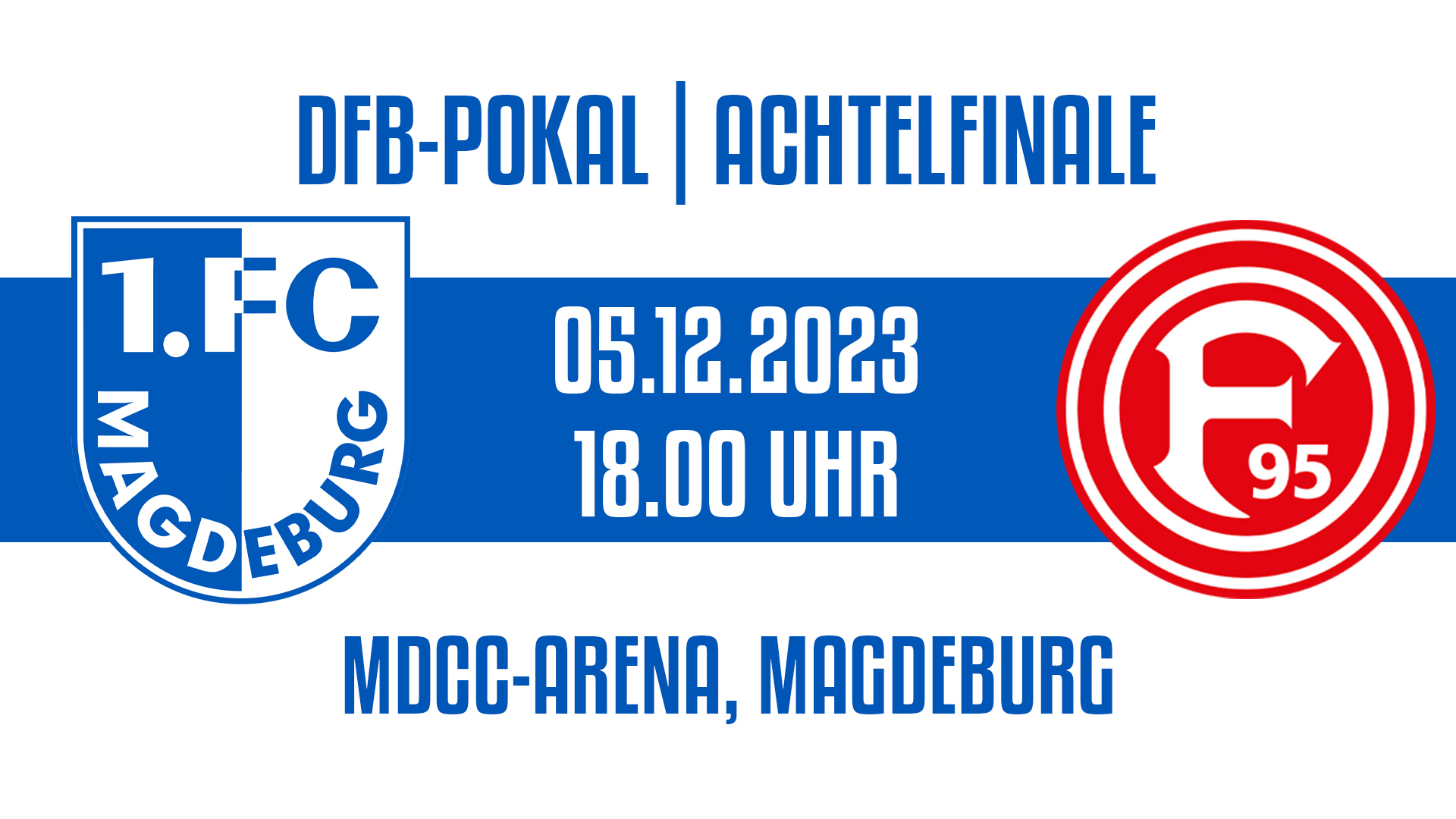 Der Deutsche Fußball-Bund (DFB) hat heute die Achtelfinal-Partien im DFB-Pokal zeitgenau angesetzt. So wird das Heimspiel gegen den Fortuna Düsseldorf am Dienstag, 5. Dezember, um 18 Uhr stattfinden. Austragungsort der Partie ist die MDCC-Arena Magdeburg.