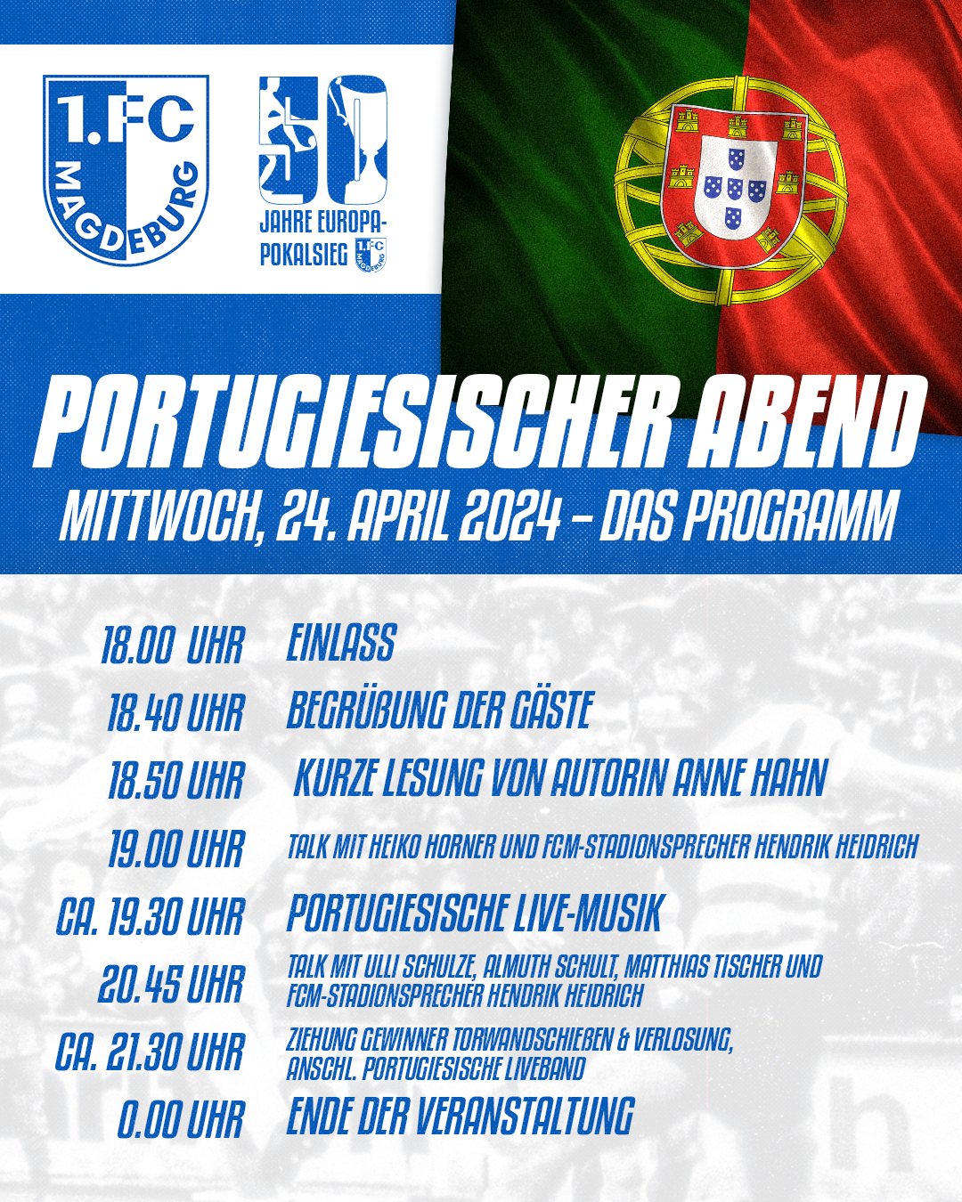 Um den Finaleinzug noch einmal zu feiern, wird es einen Portugiesischen Abend in der Festung Mark (Hohepfortewall 1, 39104 Magdeburg) geben. Neben portugiesischen Spezialitäten und einem abwechslungsreichen Rahmenprogramm mit Torwandschießen wird es auch mehrere Talks mit Fußballgästen geben.