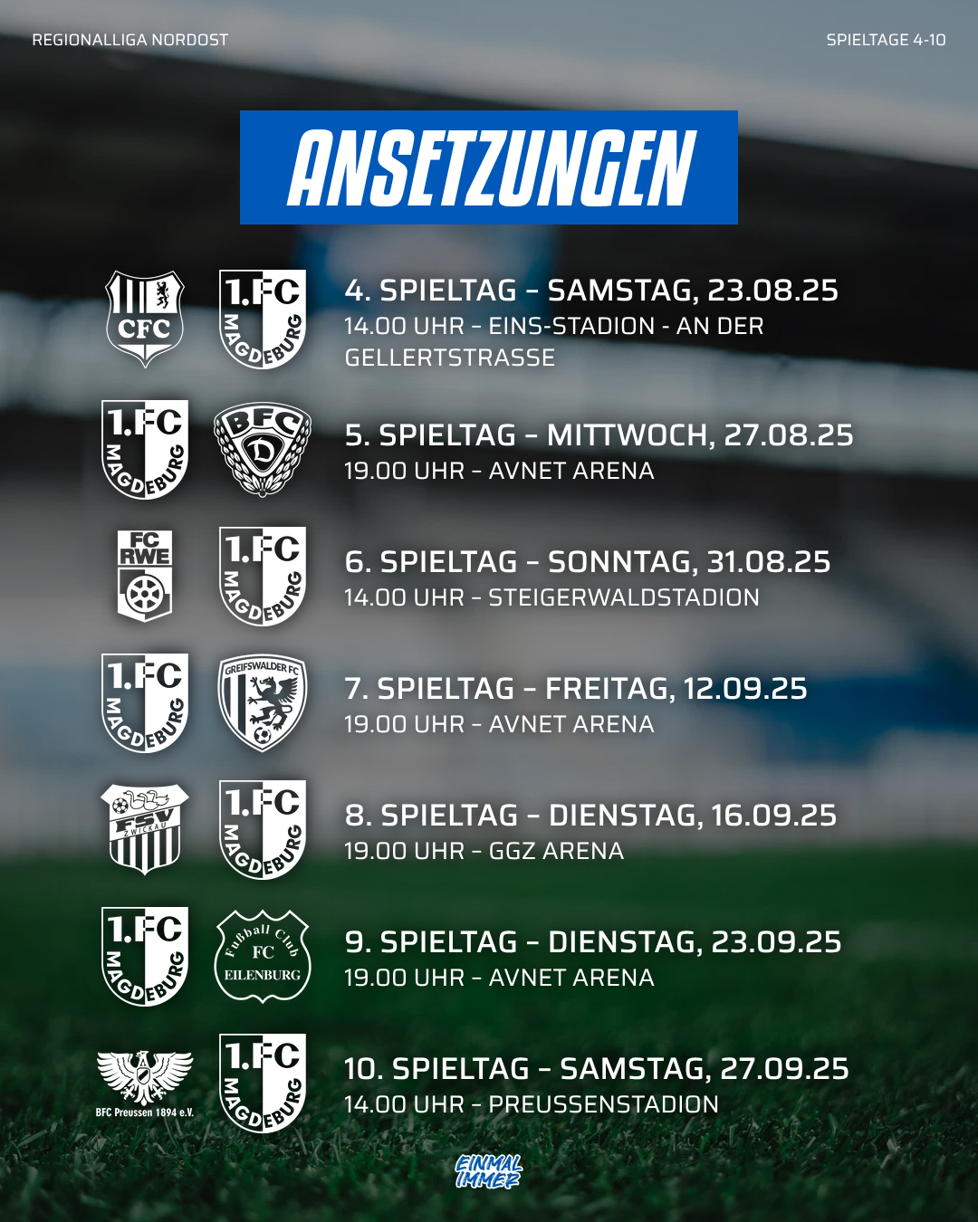 Dabei handelt es sich um unsere Heimspiele gegen BFC Dynamo, Greifswalder FC und den FC Eilenburg sowie die Auswärtsspiele gegen Chemnitz, Erfurt, Zwickau und BFC Preußen.