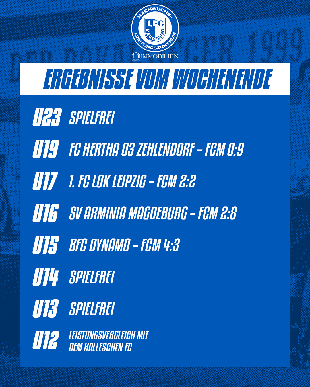 1. FC Magdeburg U17: Möbius – Bögelsack, Klause, Zopf, E. Siebert, Adrian, Barth (60. Rosenbusch), Ventzke (65. Danz), Peters (50. Rektorik), Hajdarpasic (60. Barnau), Madumere